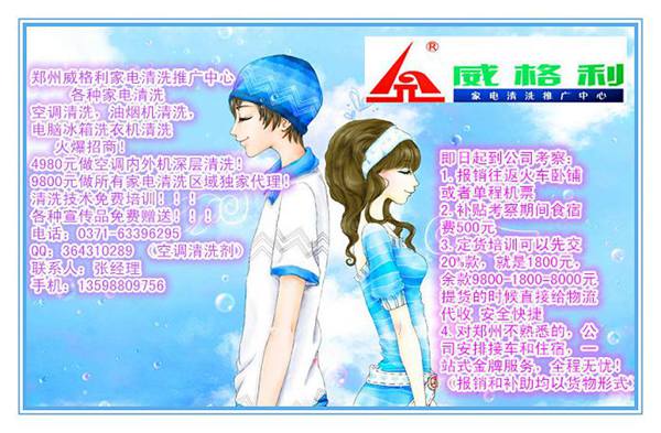 根據(jù)“鄭州洗多多空調(diào)清洗推廣中心”專家介紹,家用空調(diào)清洗主要是上門服務(wù),因而*門面,只需一間普通的辦公室(作按待和倉庫用)或在家辦公,主要是要有一部電話,2-4名工人,工具費(fèi)用每人只需20-30元,再有部分流動(dòng)資金購買*清洗劑即可,總投資只需要幾千元即可。“洗多多”現(xiàn)正在*誠招合作代理,并*收加盟費(fèi),*費(fèi)培訓(xùn)空調(diào)清洗技術(shù),*費(fèi)提供彩頁條幅工作衫等宣傳用品。