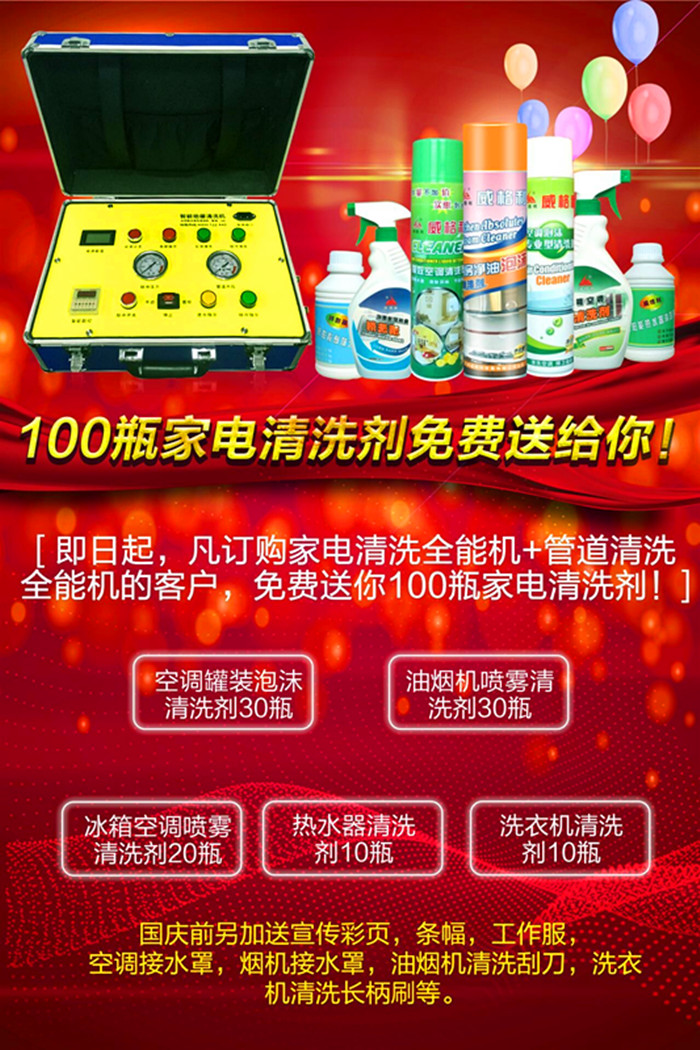 即日起,凡訂購家電清洗*能機(jī)+管道清洗*能機(jī)的客戶,*費送你100瓶家電清洗劑!