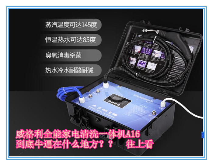威格利*能家電清洗一體機(jī)。常溫水、熱水(水溫可調(diào))、熱蒸汽、臭氧消毒于一體,能深度清洗空調(diào),油煙機(jī),洗衣機(jī),冰箱,電熱水器,飲水機(jī)等。