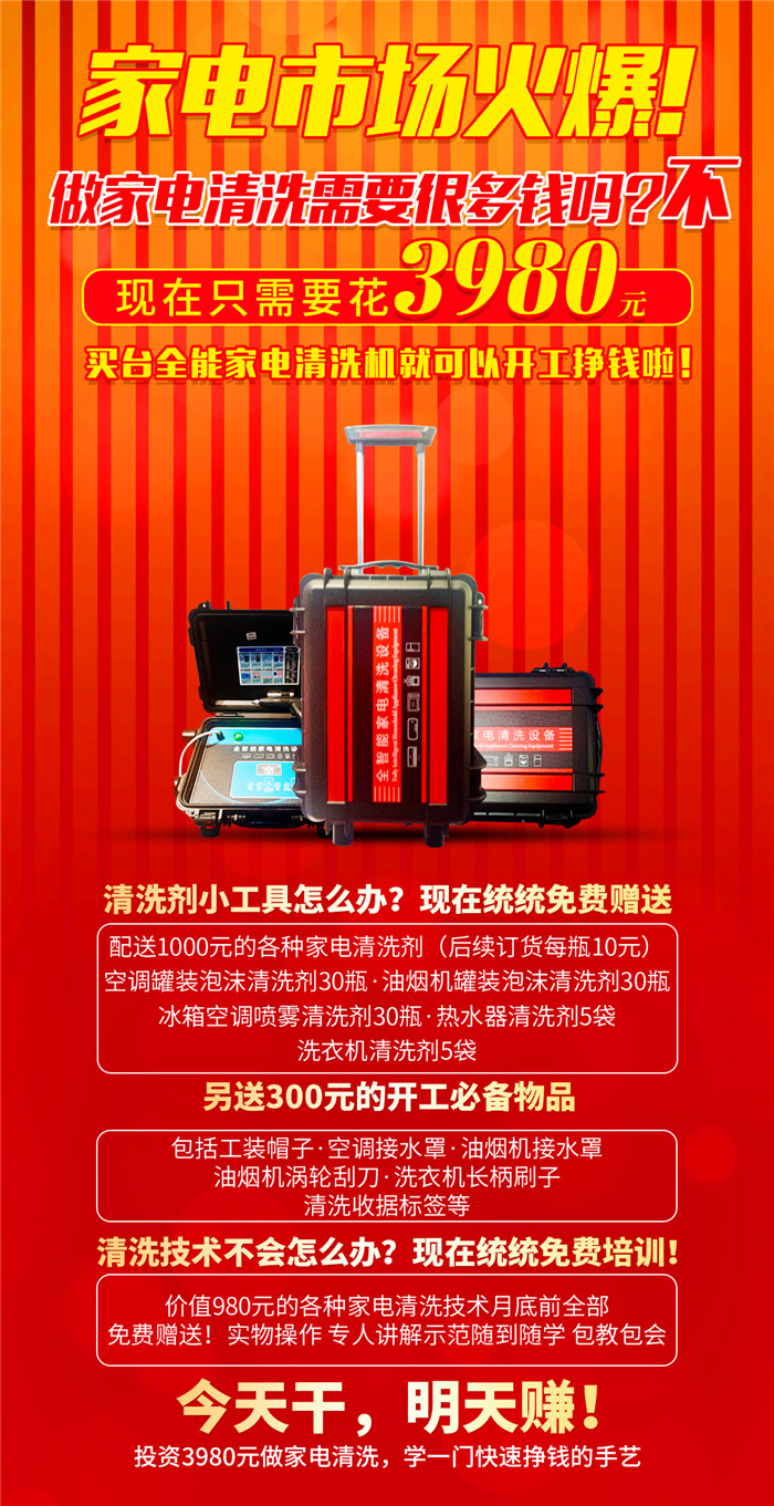 很簡單:1.沒加盟費。家電清洗*能機一體機+多功能管道清洗機+280瓶家電清洗劑,只要9800元就算加盟。