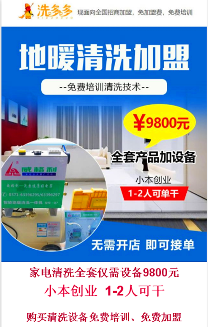 很簡單:1.沒加盟費(fèi)。家電清洗*能機(jī)一體機(jī)+多功能管道清洗機(jī)+280瓶家電清洗劑,只要9800元就算加盟。