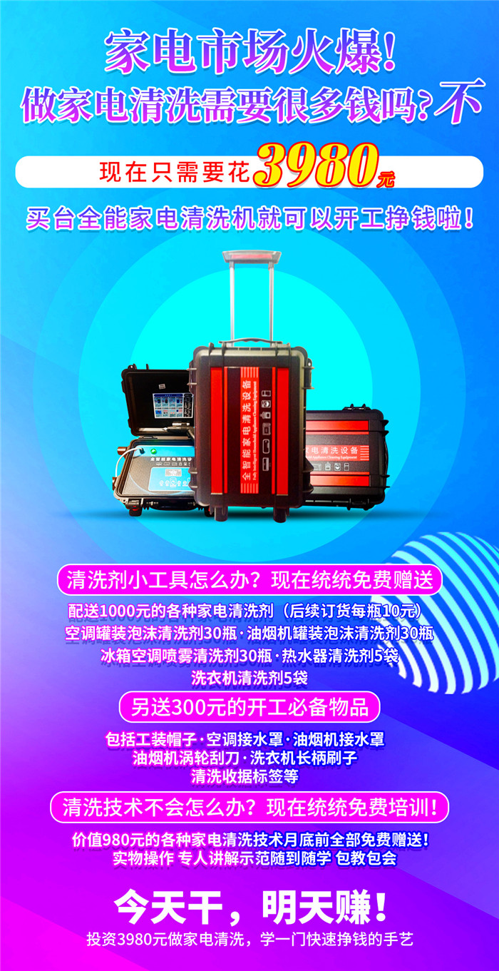 單*培訓的話,每人是980元,都是實物操作,包教包會的。這個機器不*可以清洗*的家電,比如空調,油煙機,冰箱,洗衣機,熱水器等,還能清洗各種管道,比如地暖,自來水管道等,非常的實惠和實用。這個機器現在也是只收個4980的機器錢,直接贈送1000元的開工大禮包(包括清洗劑,工具等)
